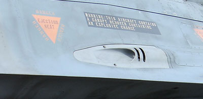 ![]() probably a Greek F-16DM , with also the thicker wheels and an antenna on the dorsal fin ![]() travel pod ![]() . ![]() F-16D with GE F110 engine which is more powerful than the older F100 engine; they have a bigger air intake and different afterburner nozzles than earlier F-16's; Note: on some Hellenic F-16A, on the right tail base fairing a ECM antenna is often seen. |