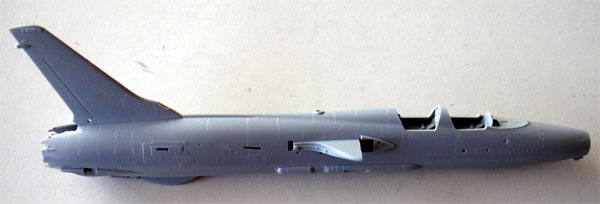 First, complete the overall assembly before fitting the undercarriage to prevent damaging these parts. Do this at step 15. The fuselage ventral fin a much too thick, so sand thinner. Inside the fuselage, I missed an exhaust