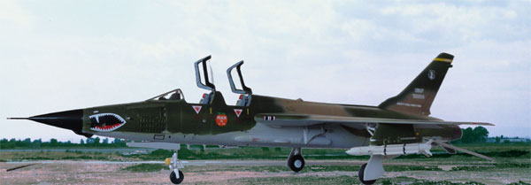 | The Republic F-105 Thunderchief was designed in the mid fifties as a high-speed fighter-bomber to primarily drop a single nuclear bomb on the enemy target. First flight was October 1955. Soon the F-105 was particularly used in the old fashioned bombing role during the Vietnam conflict. The F-105 suffered large losses during the Vietnam war with almost half of the aircraft lost, due to enemy fighter intercepts but also SAM surface-to-air missiles. The F-105D was the most common single seat ground support version. Also a two-seat F-105 variant was developed with a navigator / system man that enabled accurate bombing. The F-105F was used as basis forthe F-105G Wild Weasel that was used to suppress enemy radar and attack SAM missile sites. ECM pods were fitted on the lower fuselage sides. The type was used until 1984. Some 833 F-105 were manufactured.