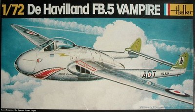 The Vampire as a 1/72 model was released by several kit manufacturers. One of the first 1/72 models was from FROG from 1971, which kit I do not further know. ![]() A better kit of a Vampire FB.5 was made by HELLER in 1979 (also released in a Revell package from 1991 and by many other brands but often more or less copies of the Heller kit). Now some more detailed kits are available by MPM used the Special Hobby and Azur brands and also in a Revell release (to be made all as well). Amodel had though short run a kit and CMR a kit in resin. But the Heller kit is quite nice and cheap. Of a two seater Vampire T.11, Airfix
