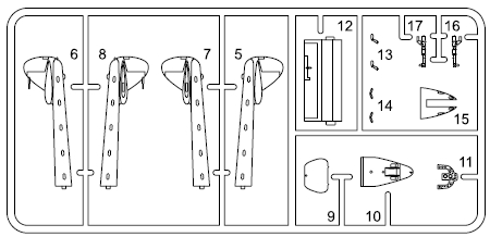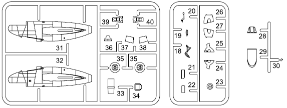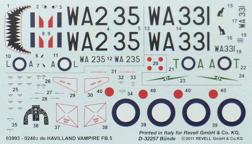 HELLER The Vampire FB.5 kit (no.283 but also released in various boxes with different decals) has about 40 parts. Wing tips are clipped and dimensions and shapes look OK. Parts layout is seen here: