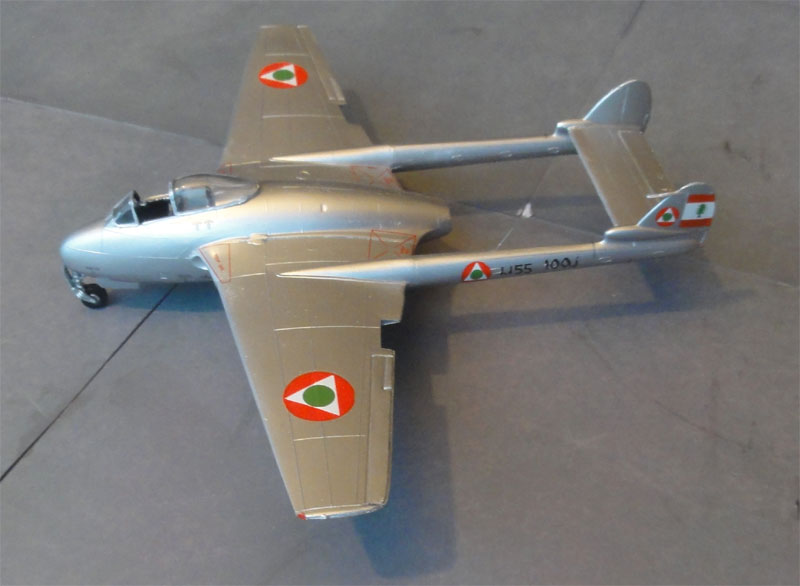 ![]() ![]() Another Revell released Vampire 1/72 kit was made. This model was finished again in the silverdope scheme as described for a Rhodesian used Vampire, but now a FB.mk 52 of the Lebanese Air Force. As before, decals came from the ESCI set. I did not manage to put enough weight in the nose... so a small rod below the aft fuselage was needed to keep it nose down...