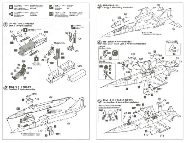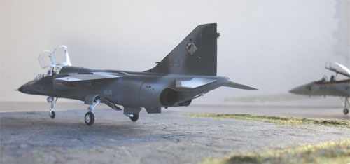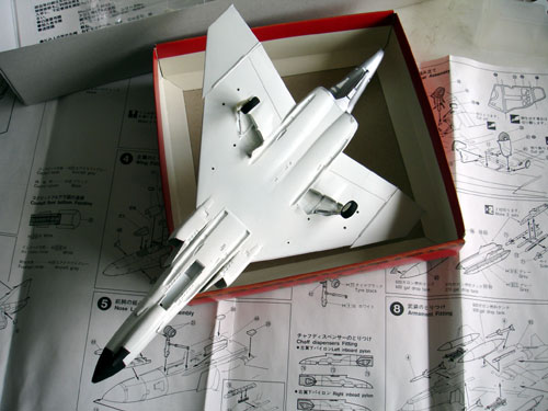 Below, you see an over 15 years old Hasegawa model made of a camouflaged F-1 single seater "interceptor/ attacker". It was made from a T-2 kit, with the "rear" cockpit faired over for which you got a solid part "D3" needed for the F-1 in the kit. It was already in the sprues, but not mentioned I think. The original boxart is seen here...