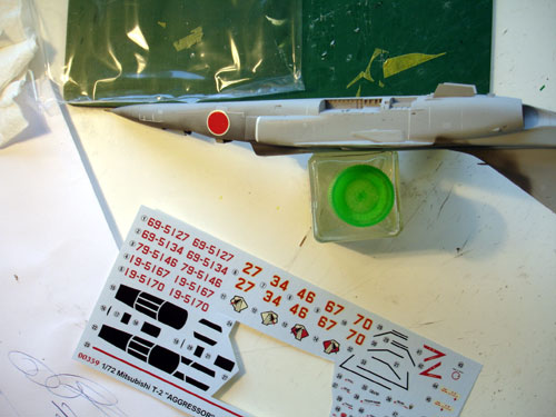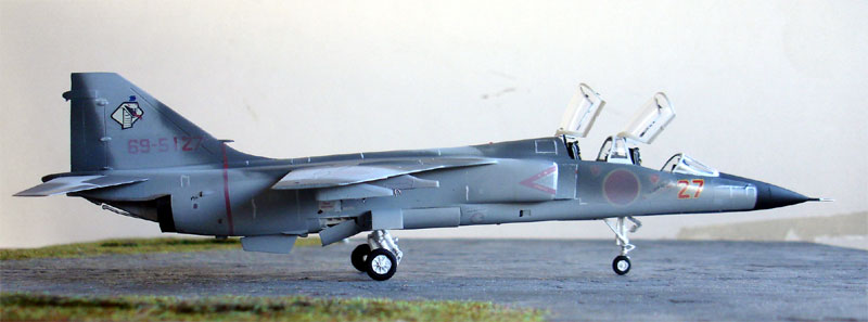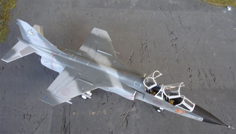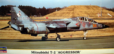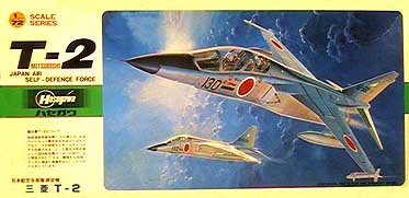 Mitsubishi T-2 The T-2 is a two seat advanced trainer that made its first flight in 1971 to be used to train fighter crews. The type strongly resembles the Sepecat Jaguar and uses similar engines. The F-1 was a single seat interceptor/ attacker variant derived from the T-2 that was also built. The rear cockpit of the T-2 is faired over with the space used for additional fuel. Other modifications include extra pylons and 20mm Vulcan cannon. The F-1 can carry missiles like the AIM-9 missile and anti-ship missiles. A total of 77 F-1 aircraft were built. It entered JASDF service in 1978, replacing many T-33's. Both the T-2 and F-1 have been issued as kit by Hasegawa in 1/72 scale, starting in 1985. Between the T-2 and F-1 kits many parts are similar. These