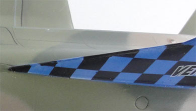 Continuing with the tail.... (4) Apply the base black checker decals for the tail base. At the rear, I had to remove about 3 mm. Apply also a decalsoftener to get the decals wrap around curves. I used MicroScale Set and Sol. The decals are very good and thin. Also apply the large "dragon decal" and the red upper tail tip decal, (painting the red section is also possible if you prefer that);