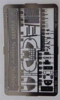 For the stores it has many pylons for under the wings, "stores" are Bullpup and Sidewinder missiles and the later style and longer 335 gallon fuel tanks. The Sidewinder horizontal "T-" pylons look a bit strange. The nose intake is very undeep with no intake tunnel. The kit has the ventral speed brake with the later style larger cut-out for a central fuel tank (this is not in the kit). Two types of engine nozzles are supplied as well as the later standard arrestor hook. The wing slats are integrally moulded "closed" with the wing. On the transparant single clear canopy a strange rear frame is moulded at the rear, it should NOT be there so polish this away. It appears that the arrester hook was fitted after 1962 on most USAF aircraft so was not present on earlier Super Sabres. No bombs, TERs or rockets are in the