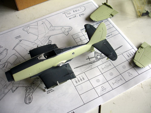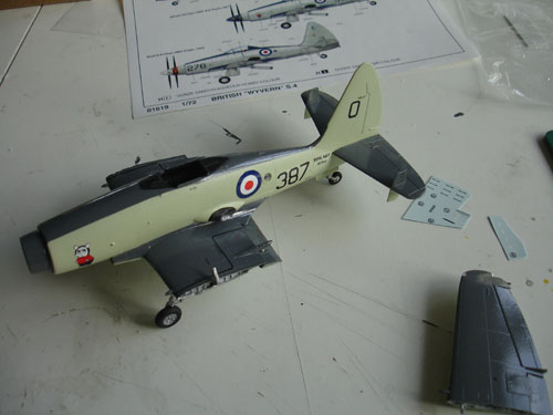 The overall model was given a light grey coat. Next, the under surfaces (including the wheel bays and inner doors) were sprayed Sky, not silver as instructed. The upper fuselage and wing were