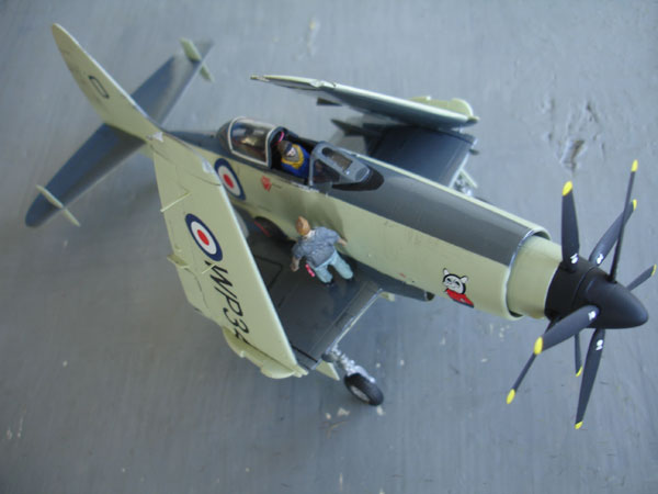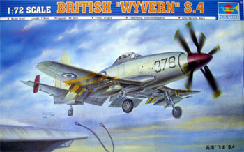 The Westland Wyvern was intended as a carrier based attack plane with torpedo armament but also with secondary fleet protection "fighter" duties. Development started after the second world war and high performance needs indicated that a high power engine with counter rotating prop would be required; the Wyvern was in the middle of the upcoming "jet age" but only later the new "turbo prop" was used for this type. It gave teething problem to control the power of this configuration which is obviously very important for a carrier aircraft. The final S. Mk 4 version (of which 96 were build) appeared around 1956, but still there were many problems such as short range and a not very high reliability. Many Wyverns were lost due to accidents and a few saw combat during the Suez War of 1956. Wyverns operated from HMS Eagle and also later HMS Ark Royal but were withdrawn from service in 1958.