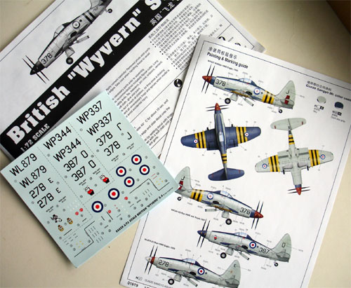 The decal sheet is for 3 planes: for 813 sq HMS Ark Royal, sq 813 HMS Eagle, 830 sq HMS Eagle Suez campaign with yellow-black stripes. The decals are not perfect however.
