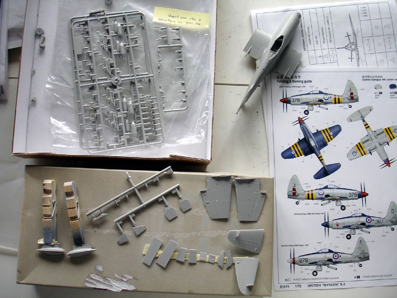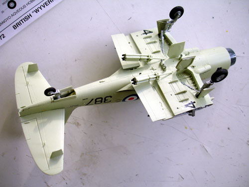 The wing and stabilizer fitted perfectly and hardly any filling is needed in the further assembly of this kit. The wing folding is a remarkable item on this aircraft and the Trumpeter kit provides it all. On service Wyverns however, the wingtip folding was "dis-abled"; so the wing tips were glued straight onto the wing ends. The transparent edges are nice extra's on this model, but need a little trim work to get a good fit. The outher wing halves were assembled without trouble. The trailing edge fowler flaps are nice touches also to this model and were set dropped down. The undercarriage was painted metal/aluminium, the tires "tire black" but these were not yet fitted.