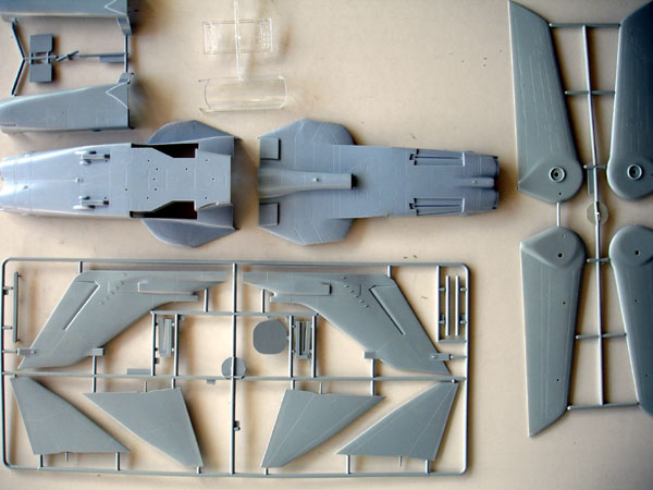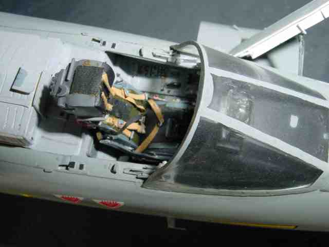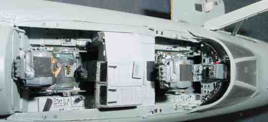 The wider nose section required a whole new approach with new cockpit interior, new canopy (made with a balsa plug and clear acetate sheet) and corrected fuselage contours. The instrument panels, seats and details were made from card and sprue. |